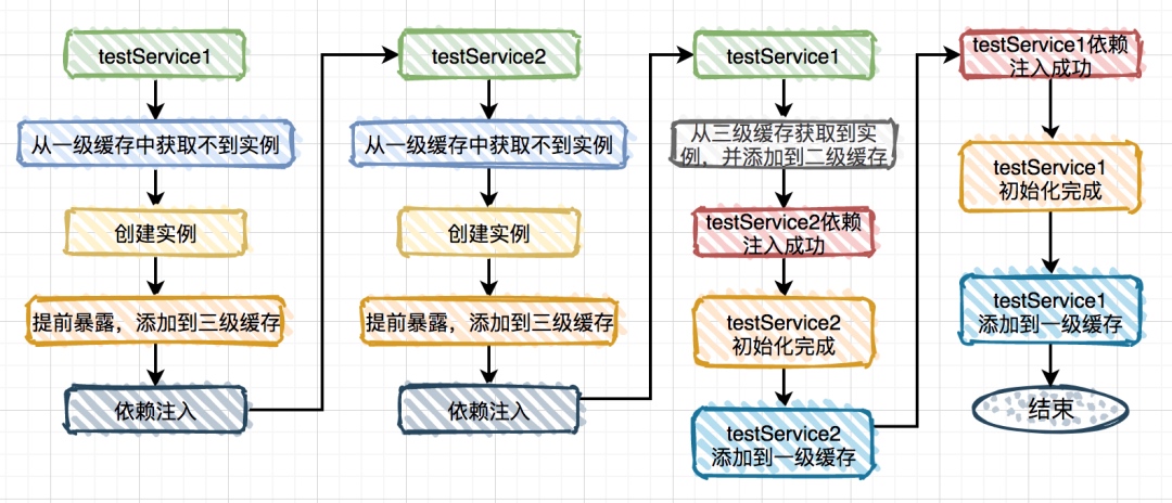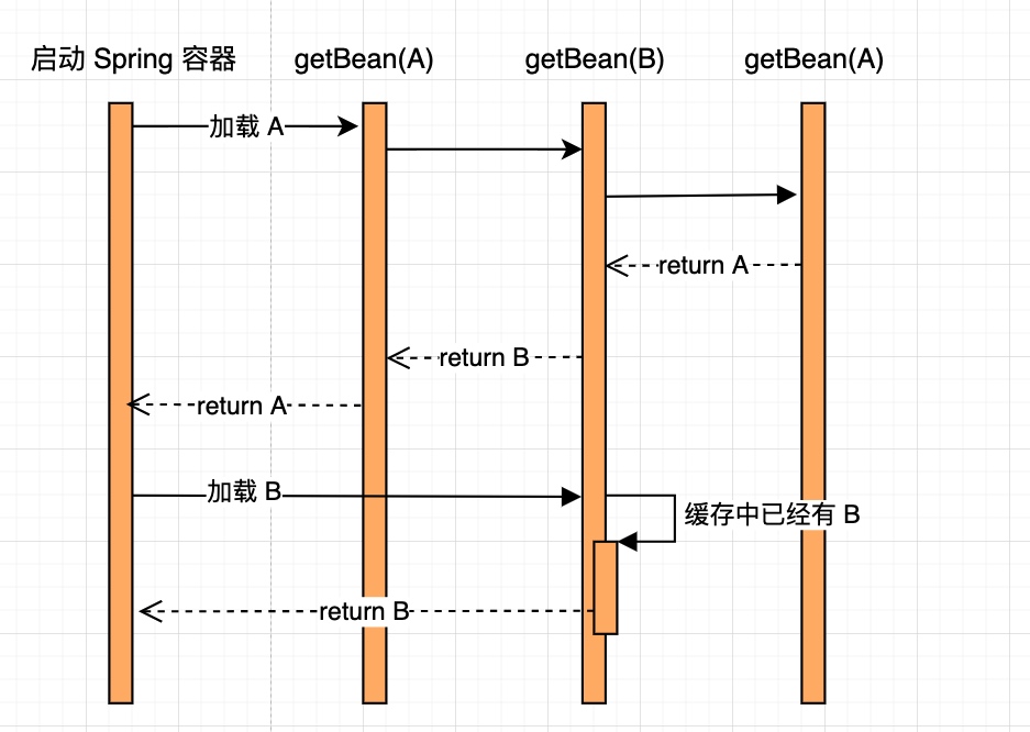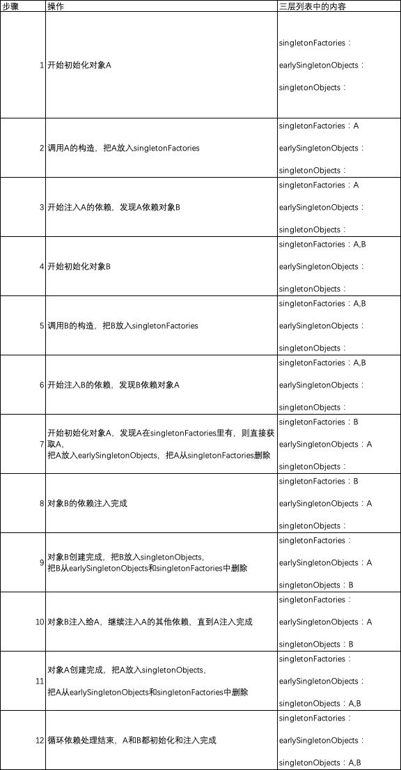这个流程图分为了 三列,第一列创建 bean A 的流程,在创建 A 的时候发现要依赖 B,第二列就是创建 bena B 的流程,在创建 B 的时候又发现依赖 A,第三列就是 创建 B 的时候 创建 A 的流程。
