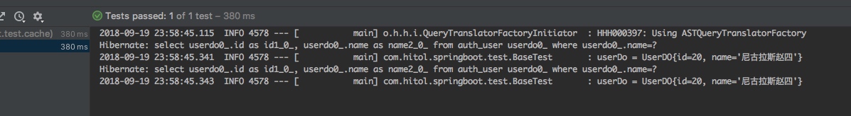 配置了findByName的函数返回值将会被加入到缓存。同时在查询时,会先查询缓存,若不存在才会查询数据库。